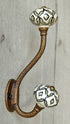 Stunning textured cast iron wall hook and hanger with two grey floral ceramic knobs best suited for coats, towels, umbrellas and hats. Our wall hooks are the perfect blend of style and functionality. Crafted from high-quality material, these hooks are not only durable but also add an elegant touch to any room. The finish has a timeless appeal that complements any decor style, from modern to traditional. The price listed is for a single piece. Screws are provided with the hook.
